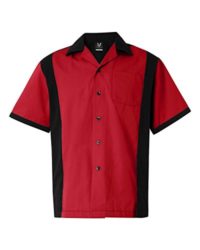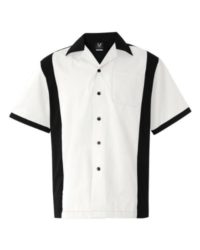 4.5 oz, 60% cotton/40% polyester lightweight soft twillFull-button front with black buttonsLeft chest pocketContrasting notched self-collar and side panelsBack is solid blackHemmed sleeves with contrast color trimSquare cut bottom