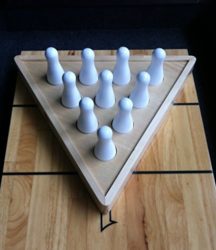 Turn your shuffleboard into a new exciting game with these bowling style pins! These pins are made of quality hardwood ensuring countless games. This set includes the wood pin-setter