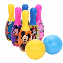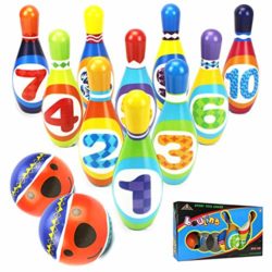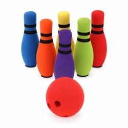 This bowling toy set is made with food grade soft foam material,the pins and ball are weighty,but not too much to cause destruction of other items in the house.This
