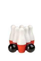 6 PIN BOWLING Rack ’em up. Practice and play with this all-in-one bowling kit. Each set comes with two lightweight black plastic bowling balls and six white and red